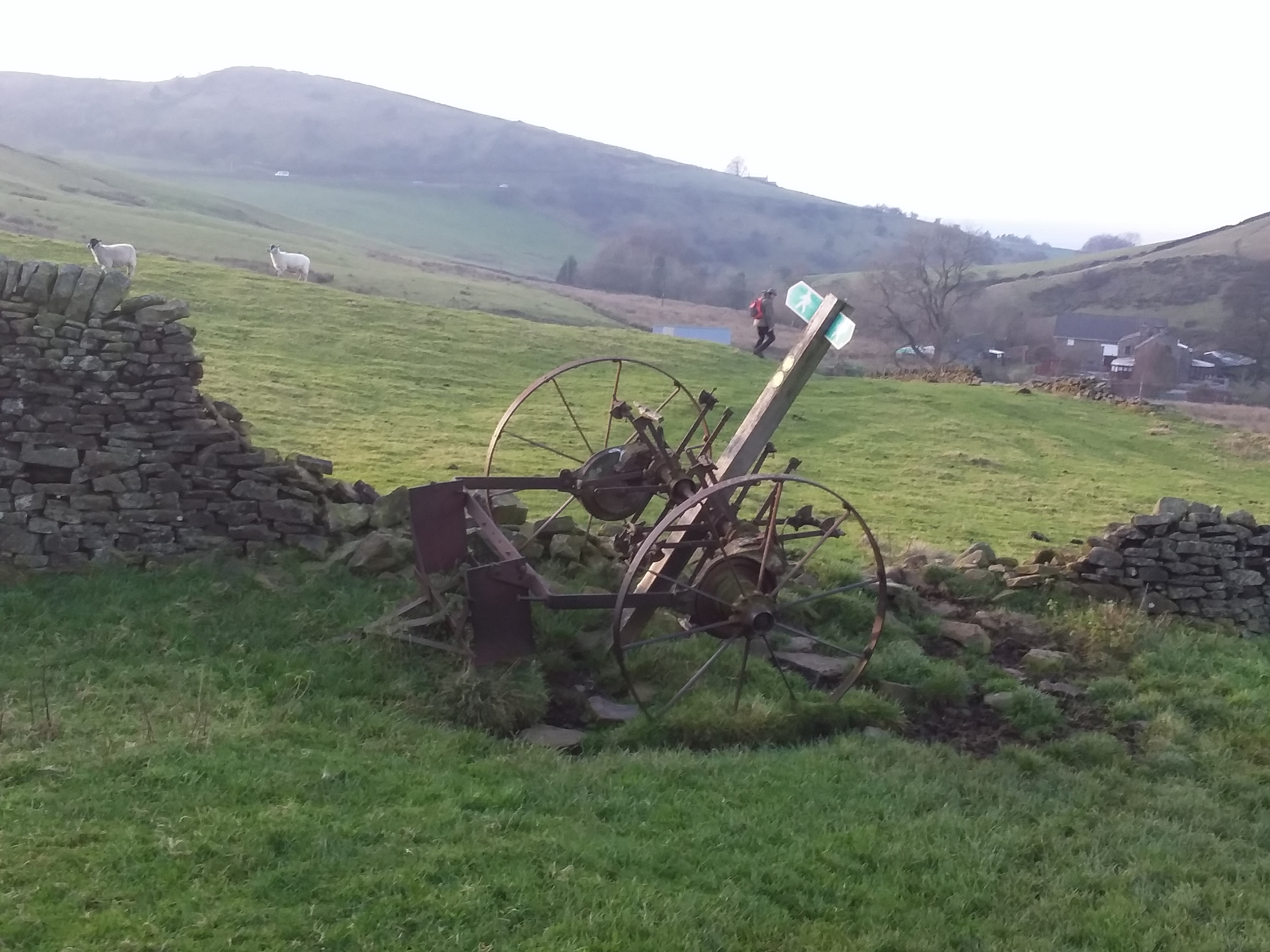 Farm relic holding up sign post near Walker Barn